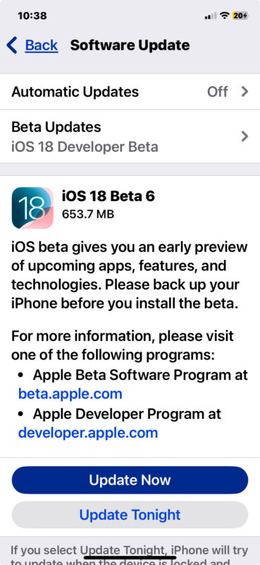 - Sélectionnez « Mettre à jour maintenant » pour télécharger et installer iOS 18 bêta 6