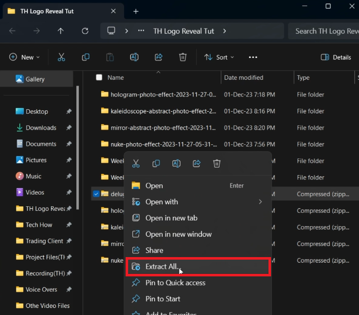 Pour les utilisateurs Windows :Cliquez avec le bouton droit sur le fichier .zip et sélectionnez « Extraire tout ». Choisissez le dossier de téléchargement ou l'emplacement souhaité pour les fichiers extraits.
