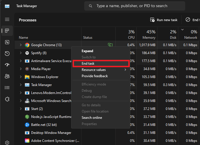 Mettez fin aux processus inutiles :Identifiez et fermez les applications inutiles qui consomment les ressources de votre réseau. Par exemple, vous pouvez trouver des services de streaming ou des téléchargements de fichiers volumineux qui peuvent être suspendus. Assurez-vous de ne mettre fin qu’aux processus dont vous savez qu’ils ne perturberont pas votre système d’exploitation.