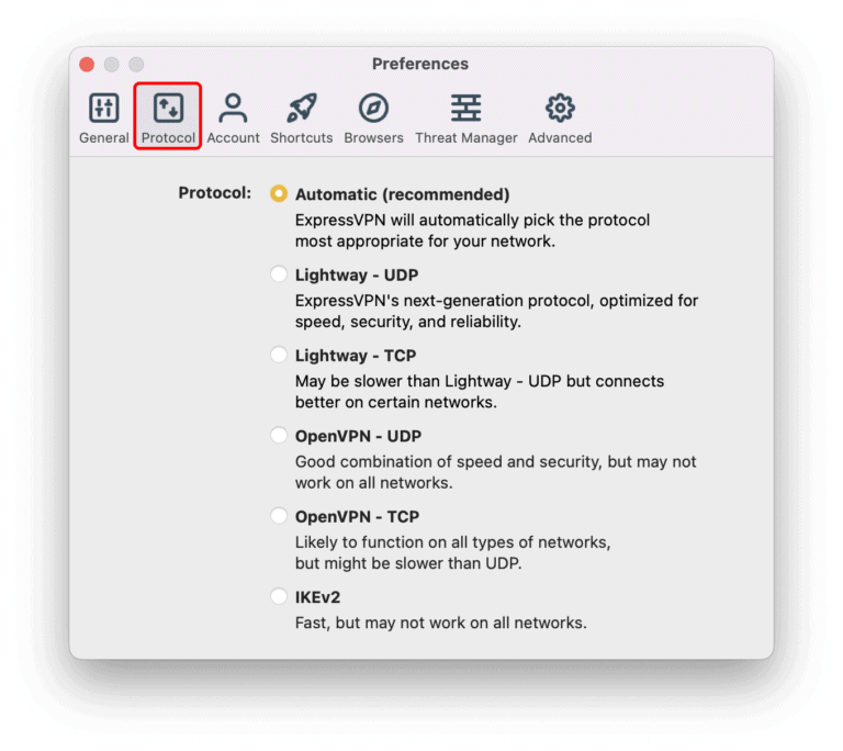 Si vous rencontrez toujours des problèmes après avoir changé d'emplacement de serveur, vous pouvez également essayerchanger votre protocole VPN.