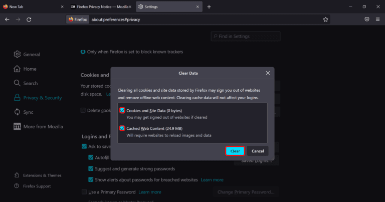 - Assurez-vous que le« Cookies et données du site »et« Contenu Web mis en cache »les cases sont cochées dans la fenêtre contextuelle. Robinet"Clair.“