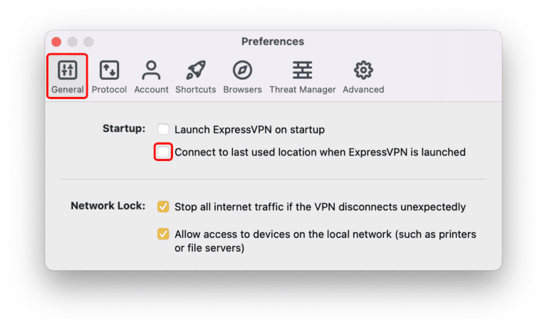 - Fermez la fenêtre Préférences et essayez de vous reconnecter à ExpressVPN.