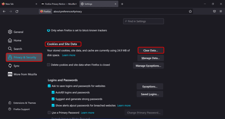 - Appuyez sur« Confidentialité et sécurité »dans l'onglet de gauche et sélectionnez« Cookies et données du site.“Cliquez ensuite sur"Effacer les données.“