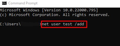 Étape 5 :Collez dans le "test utilisateur net/ajouter" Commande pour créer un nouveau compte utilisateur nommé "test.”