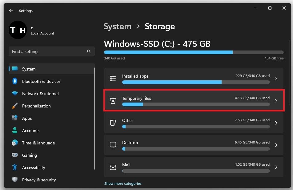 Dans votreParamètres de stockage, vous pouvez voir des informations sur votre utilisation globale du stockage, le stockage utilisé pour les applications installées, les fichiers temporaires, etc. Le moyen le plus simple de libérer de l'espace de stockage et de résoudre simultanément les problèmes d'installation potentiels est de supprimer complètement vos fichiers temporaires. Cliquez surFichiers temporaireset assurez-vous de supprimer les fichiers. Ce sont des fichiers enregistrés par vos applications qui doivent être supprimés de temps en temps.