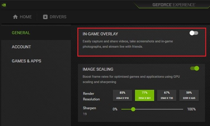 Pour éviter davantage les problèmes de démarrage du jeu, accédez à vos paramètres GeForce. Dans leGénéralsection, assurez-vous de désactiver leSuperposition en jeu.
