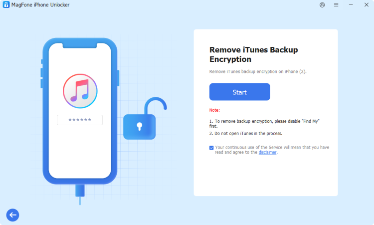 Sur l'écran suivant, vous pouvez cliquer sur le bouton Démarrer. Si Localiser mon iPhone est activé sur votre iPhone, vous serez invité à le désactiver. Après avoir désactivé Find My iPhone, le logiciel MagFone supprimera immédiatement le mot de passe de cryptage de sauvegarde iTunes de votre appareil.