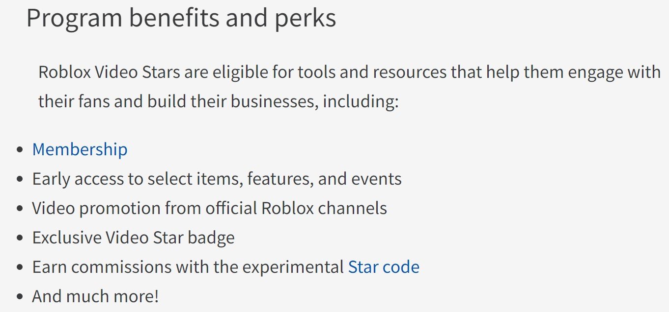 Les avantages d'être accepté dans le programme incluent un abonnement premium et un accès anticipé à une sélection d'articles, de fonctionnalités et d'événements. De plus, vous bénéficierez d'une promotion vidéo des chaînes officielles Roblox, d'un badge étoile vidéo exclusif et d'une commission de 5 % sur chaque vente Robux lorsque quelqu'un utilise votre code étoile. Après un avis positif, vous recevrez très probablement un code étoile attribué à votre compte.