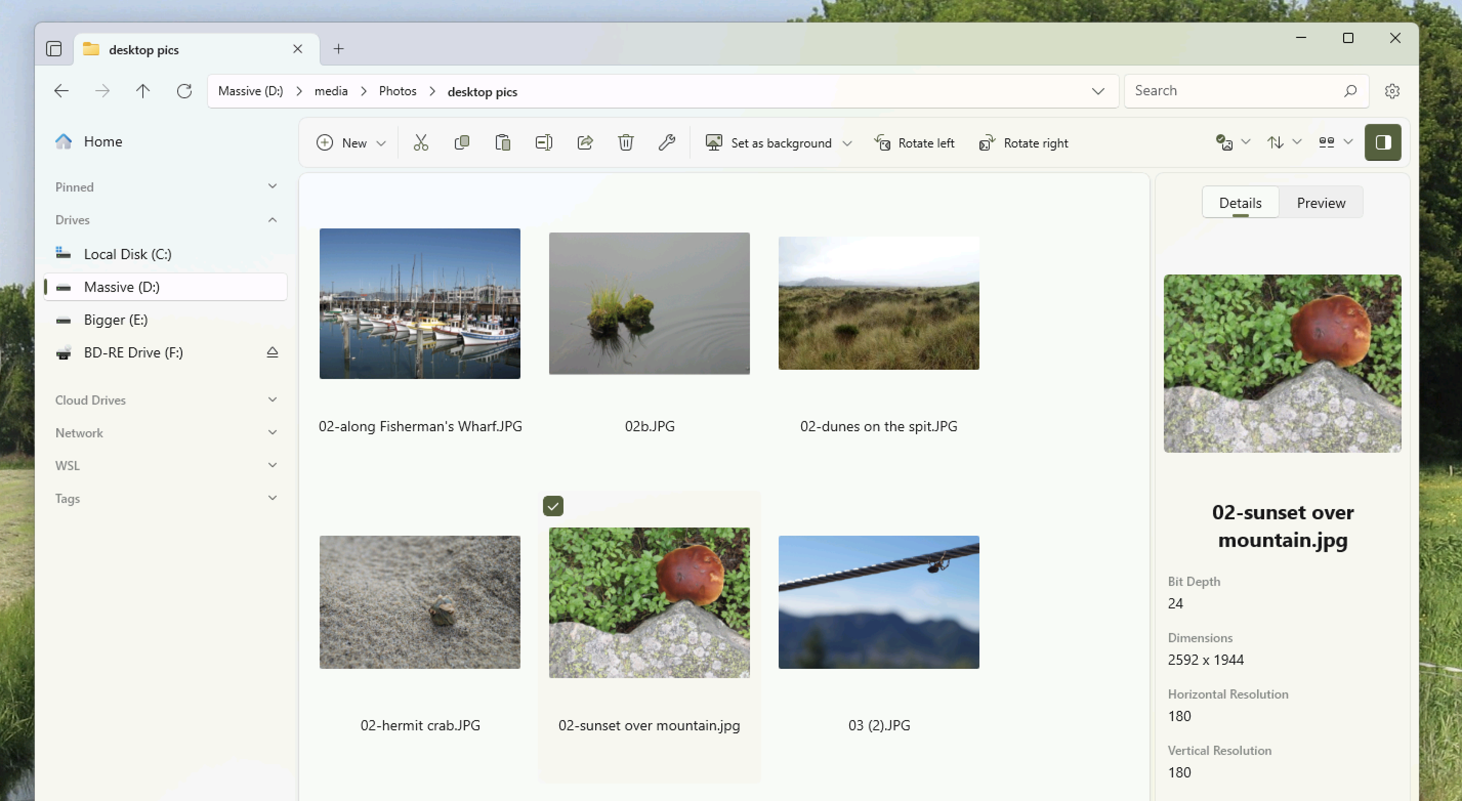 Les fichiers prennent également en charge les mêmes vues proposées par l'Explorateur de fichiers, et il est assez efficace de deviner quelle vue vous souhaitez en fonction du dossier dans lequel vous vous trouvez. J'ai ouvert un dossier d'images, par exemple, et il m'a montré de grandes vignettes. De plus, il existe un volet d'aperçu qui inclut des détails. J'ai trouvé cela plus agréable, bien que similaire, au volet d'aperçu de l'Explorateur de fichiers.