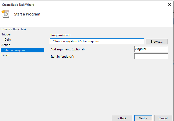 - Dans l'écran suivant, saisissezC:Windowssystem32cleanmgr.exeSection et type de script de programmedans /sagrun:1dans la section Ajouter des arguments comme indiqué ci-dessous –