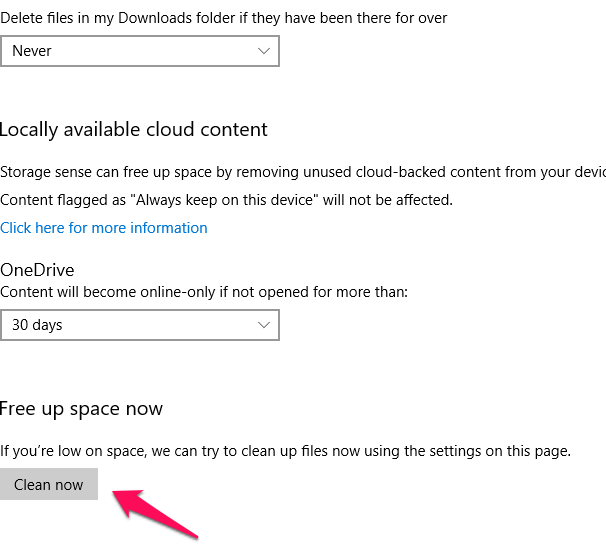 Bien que le sens du stockage soit une excellente option pour nettoyer les fichiers temporaires rapidement et sans aucune intervention de votre part, il nettoie les fichiers uniquement lorsque l'heure indiquée est atteinte. Si vous pensez que certains fichiers inutiles sont toujours omis, vous pouvez envisager de revenir sur la page et de cliquer surle Nettoyer maintenantoption.