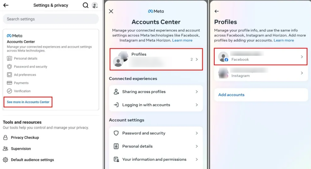 - Appuyez sur Centre de comptes et sélectionnez Profils. Appuyez ensuite sur votre nom.