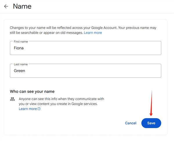 - Changez votre prénom et votre nom. Cliquez ensuite sur Enregistrer.