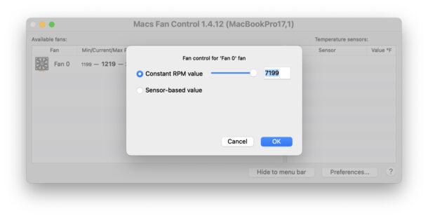 Pour mon cas d'utilisation spécifique avec cette application, je mets les ventilateurs à vitesse maximale chaque fois que j'utilise mon Mac en plein soleil à l'extérieur, même les jours les plus doux, à titre prophylactique pour maintenir la machine aussi froide que possible. Si vous utilisez également un moniteur de température sur votre Mac pour surveiller la température interne, vous constaterez qu’une vitesse de ventilateur plus élevée maintient également ces températures à un niveau bas.