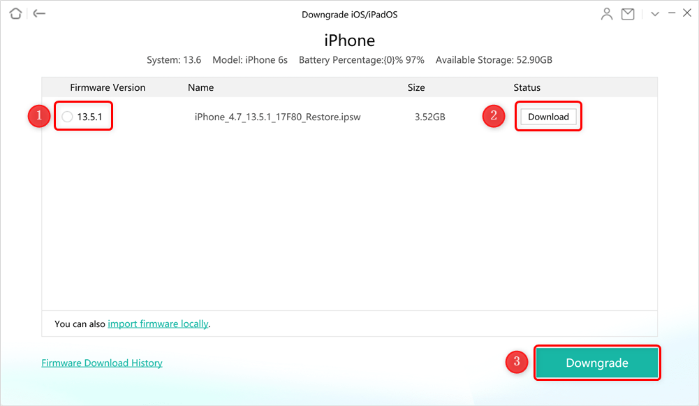 Étape 3.Ensuite, sélectionnez une ancienne version du micrologiciel pourTélécharger> Appuyez sur leRétrograderbouton pour continuer.