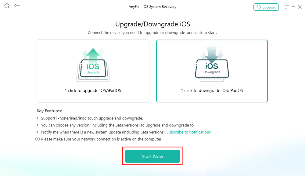 Étape 2.Connectez l'appareil iOS à l'ordinateur via un câble USB > Choisir1 clic pour rétrograder iOS/iPadOS> Appuyez surCommencez maintenantbouton.