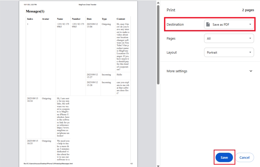 Les discussions exportées seront enregistrées au format HTML. Localisez le fichier exporté et ouvrez-le avec Google. Appuyez ensuite sur ctrl + p pour accéder à la page d'impression. SélectionnerEnregistrer au format PDFdans Options de destination. CliquezSauvegarderpour décider d'un emplacement où enregistrer le document PDF.