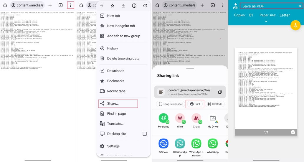 Pour les utilisateurs d'Android, ils peuvent exporter le chat WhatsApp vers Google Drive et utiliser l'option Google Print pour convertir le chat WhatsApp en document PDF.