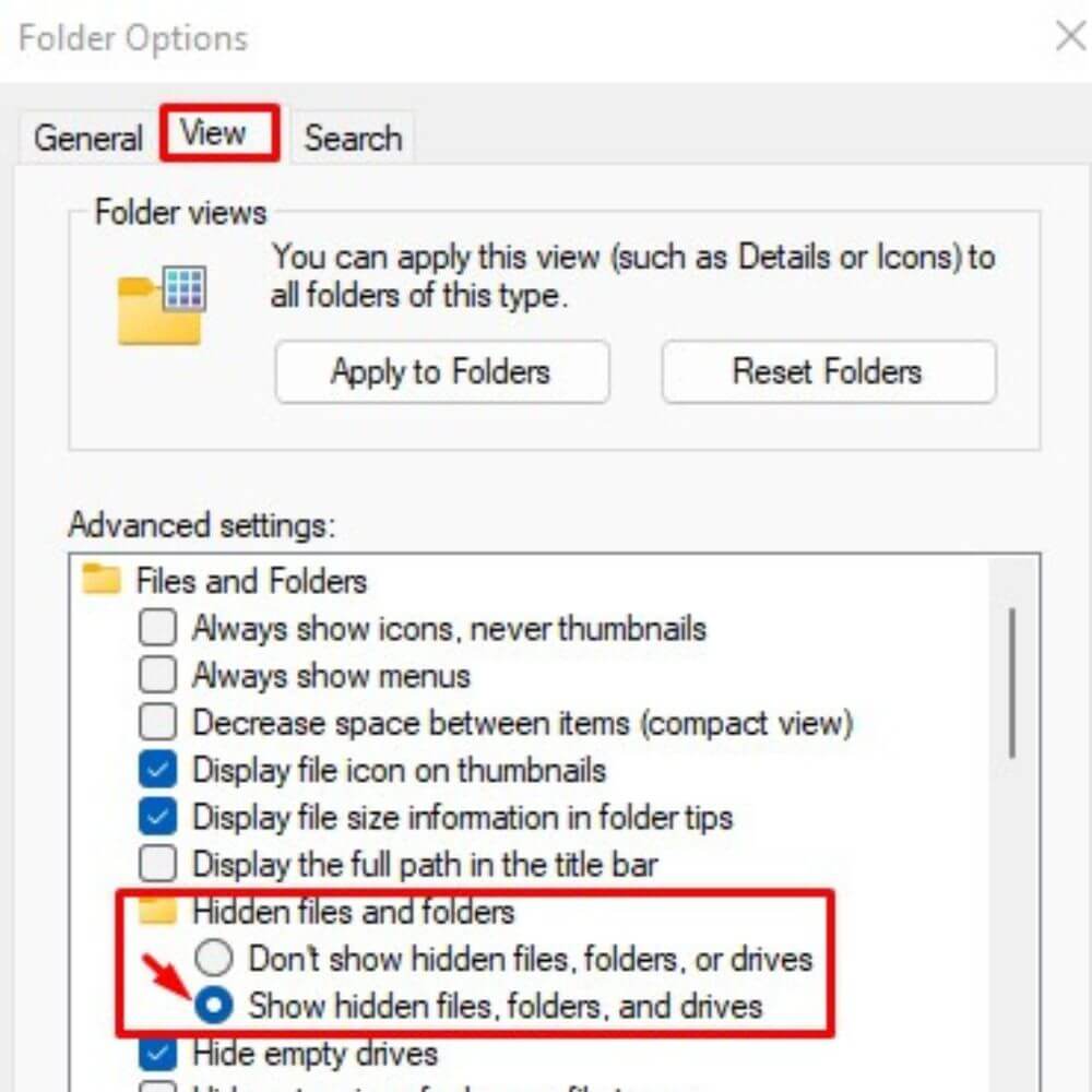Étape 15: Sous leVoironglet, recherchez"afficher les fichiers, dossiers et lecteurs cachés"et utilisez le curseur pourcliquez sur le cercle à côté. Si cela est fait correctement, un point noir apparaîtra dans ce cercle.