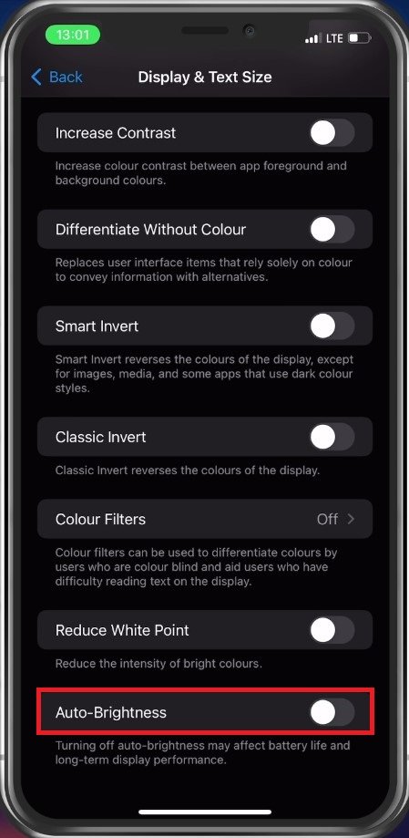 Faites défiler vers le bas et assurez-vous de désactiver leLuminosité automatiqueoption.