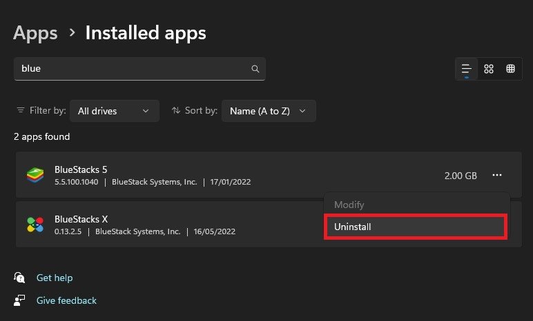 En dernier recours, vous devrez réinstaller l'émulateur BlueStacks sur votre système. Pour ce faire, ouvrez vos paramètres Windows. Ici, sousApplications, cliquez surApplications installées. Filtrez votre recherche parTous les lecteurset regardeBleuStacks. Cliquez sur l'icône du menu burger pour BlueStacks et cliquez surDésinstaller. Le programme de désinstallation prendra quelques secondes pour supprimer tous les fichiers BlueStacks.