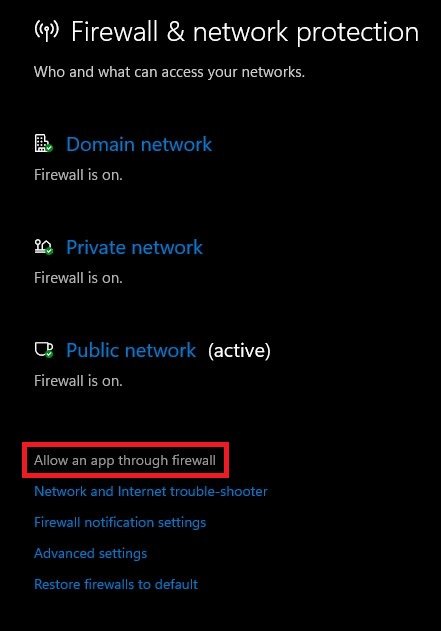 Parfois, votre antivirus ou pare-feu peut bloquer certaines parties du logiciel lors de son lancement et provoquer les problèmes de démarrage que vous rencontrez. Dans votre recherche dans le menu Démarrer, tapezPare-feupour ouvrir votrePare-feu et protection du réseaufenêtre des paramètres du système. Ici, sélectionnezAutoriser une application via le pare-feu.