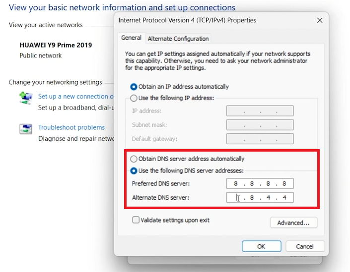 Entrez les adresses DNS :Saisissez 8.8.8.8 comme serveur DNS préféré et 8.8.4.4 comme serveur DNS alternatif. Ce sont les serveurs DNS publics de Google connus pour leur fiabilité et leur rapidité.