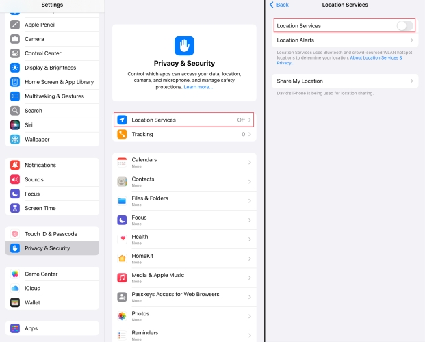 Étape 1.Allez sur iPadParamètres > Confidentialité et sécurité > Services de localisation.