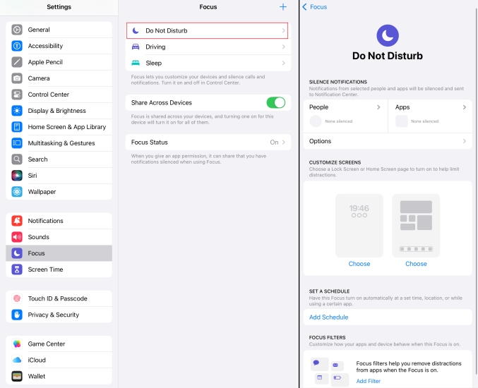 Vous pouvez activer les paramètres tels que le mode faible consommation, le mode avion et Ne pas déranger pour économiser la batterie de votre iPad directement et efficacement. Ces paramètres réduiront l’activité en arrière-plan et empêcheront les notifications push qui consomment la batterie de votre iPad.