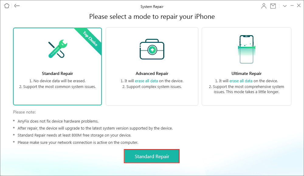 Étape 3. Vous pouvez choisir 3 modes pour réparer le problème du système iOS. Ici, nous recommandons fortement la réparation standard pour démarrer la réparation qui ne risquera aucune perte de données.