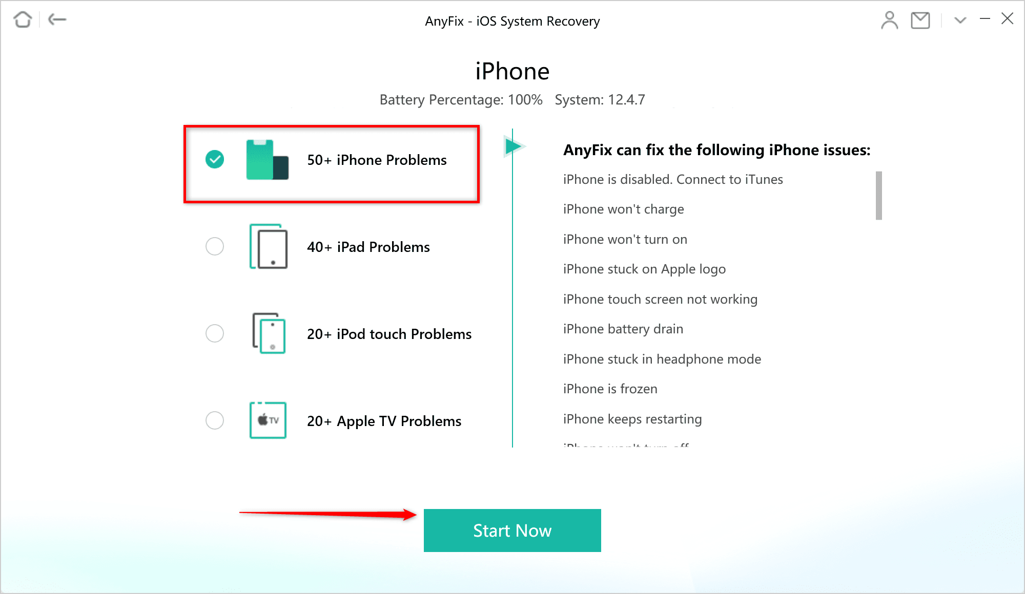 Étape 2. Choisissez « 50+Problèmes iPhone », puis cliquez sur l'option « Démarrer maintenant ».
