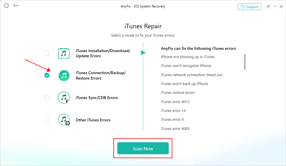 Étape 2. Dans cette partie, choisissez leErreurs de connexion/sauvegarde/restauration iTunespuis appuyez surRéparer maintenantcontinuer.