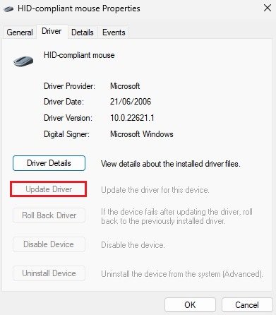 Dans leConducteursection des propriétés de votre souris, cliquez surMettre à jour le pilotesi cette option s'offre à vous. Répétez cette étape avec chaque appareil de cette liste.