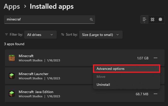 Ensuite, accédez à la section Applications de vos paramètres et cliquez sur Applications installées. Ici, recherchez Minecraft. Cliquez sur l'icône du menu burger pour votre version de Minecraft et sélectionnez Options avancées.