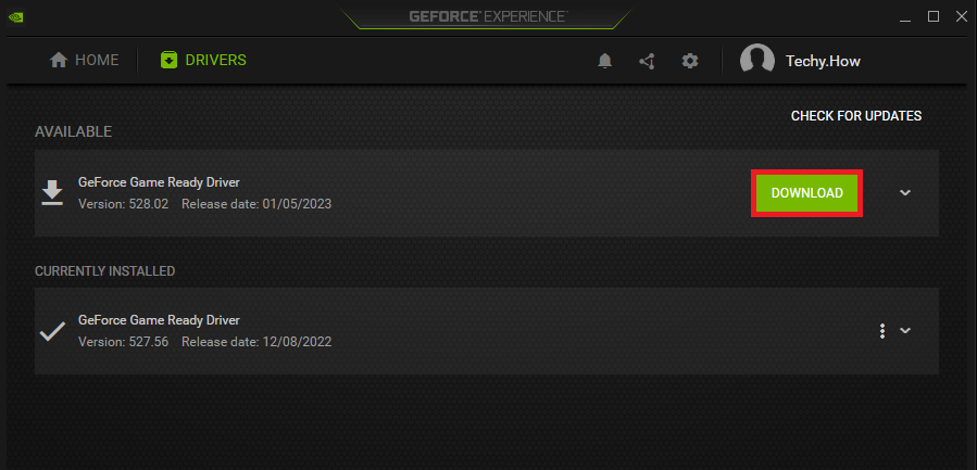Pour mettre à jour votre pilote graphique, je suggère d'utiliser l'application GeForce Experience pour les utilisateurs de GPU NVIDIA, ou le logiciel AMD Radeon lorsque vous utilisez une carte graphique AMD. Dans la section Pilotes, procédez au téléchargement du dernier pilote graphique. L'application installera alors automatiquement le pilote pour vous.