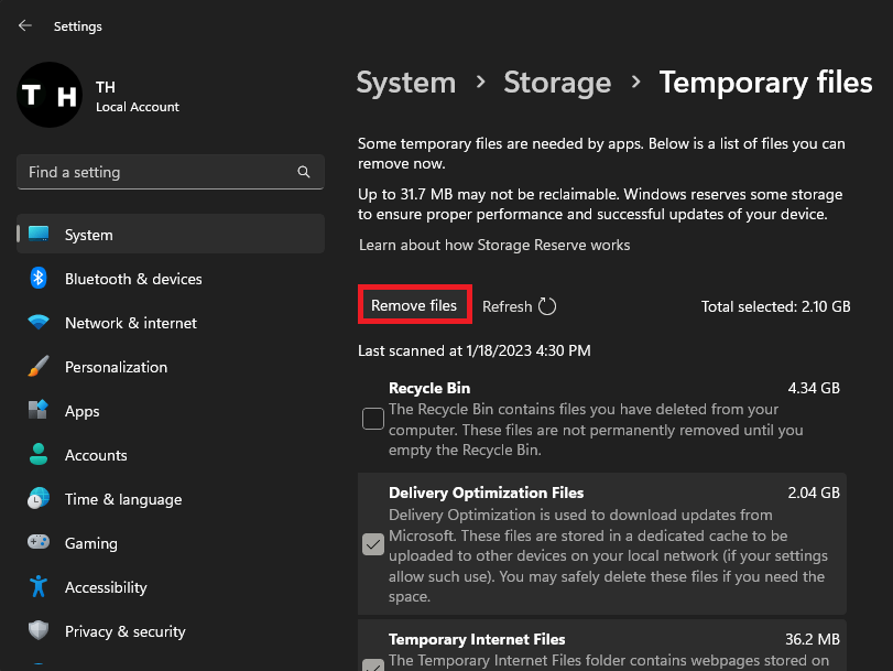 Paramètres système > Stockage > Fichiers temporaires