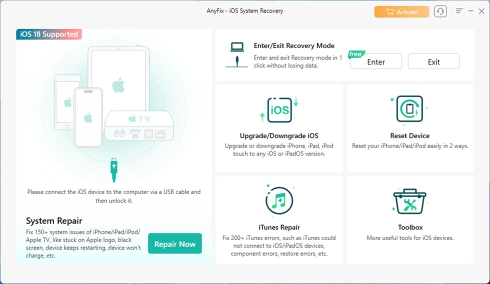 Si vous vous assurez que votre musique a disparu à cause de la mise à jour iOS 18, vous devez vous demander s'il existe des bugs système. Ne soyez pas paniqué! Vous pouvez essayer de corriger les bugs de l'application avec AnyFix. En tant que logiciel de réparation du système iOS de premier ordre, AnyFix contient une puissante fonctionnalité de réparation du système. Il peut résoudre plusieurs problèmes d'iPhone causés par les mises à jour iOS, notamment les erreurs Apple Music, les iPhones gelés, etc. Avec l'aide d'AnyFix, les utilisateurs peuvent récupérer la musique disparue après la mise à jour iOS en quelques clics. Il peut également aider les utilisateurs à quitter le mode de récupération, à réparer iTunes et à rétrograder iOS sans effort.