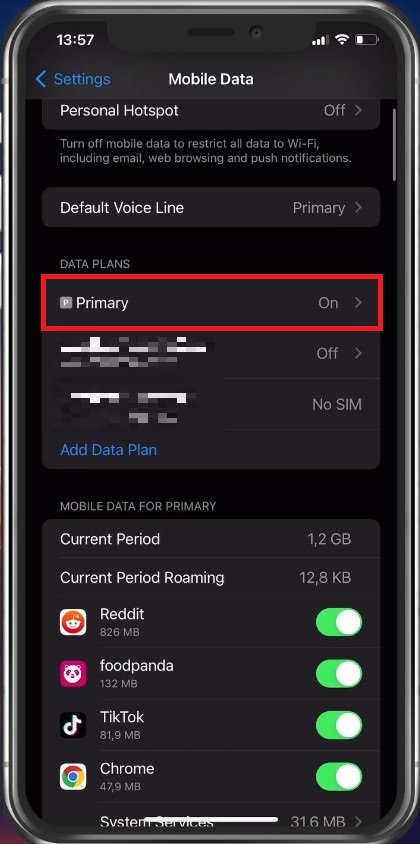 Tout d’abord, ouvrez les paramètres de votre iPhone. Ici, sousDonnées mobiles, assurez-vous que votre carte SIM principale est sélectionnée.