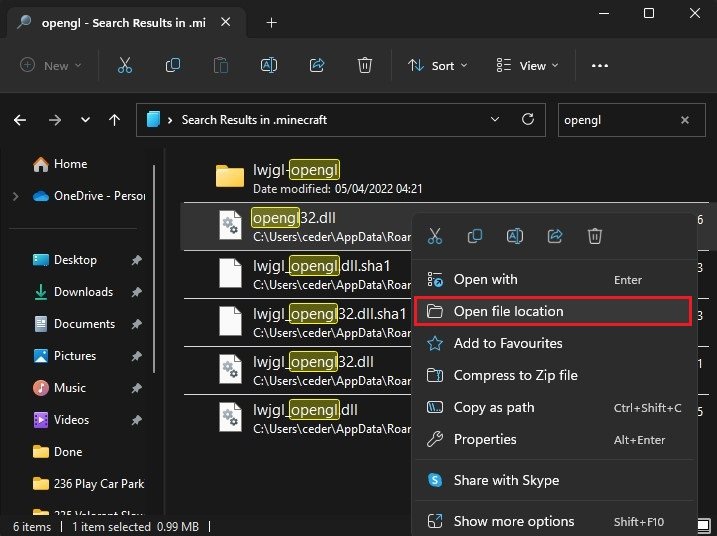 Ensuite, recherchez%Données d'application%et appuyez sur Entrée. Votre explorateur de fichiers s'ouvrira. Accédez à.minecraftet recherchez OpenGL dans ce dossier. Une liste de fichiers et de dossiers OpenGL s'affichera. Cliquez avec le bouton droit sur l'un desOpenGL.dllfichiers et sélectionnezEmplacement du fichier ouvert.