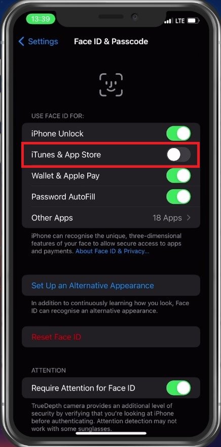 Après avoir entré votre mot de passe, désactivezIdentification du visagepouriTunes et App Store. Vous pouvez ensuite effectuer un achat dans votre App Store pour voir si cela résout le problème.