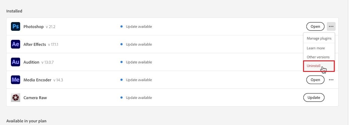 Dans votre application Creative Cloud, cliquez sur les trois points à côté de Photoshop et sélectionnezDésinstaller. Photoshop réapparaîtra dans votre section Toutes les applications, prêt à être téléchargé et installé sur votre Mac.