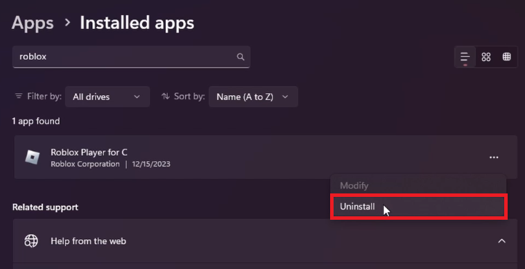 Sélectionnez « Désinstaller » pour supprimer toutes les versions installées de Roblox, y compris celles du Web et du Microsoft Store.