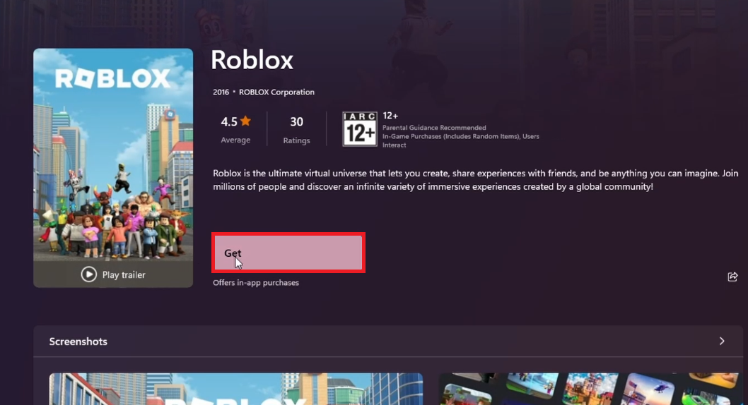 Microsoft Store > Roblox > Obtenir