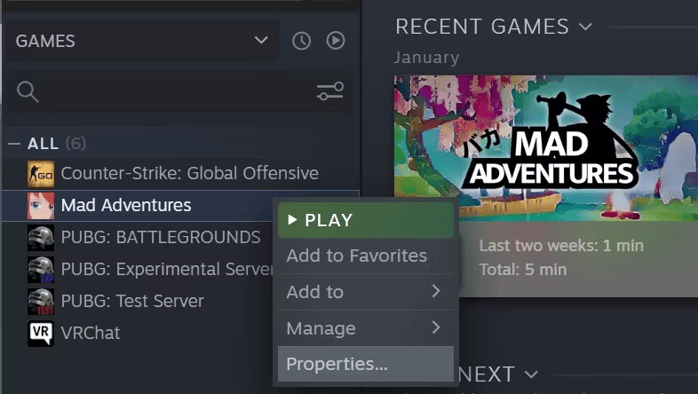 Étape 2 – Faites un clic droit sur le titre du jeu pour repérer les propriétés. Cliquez dessus pour l'ouvrir.