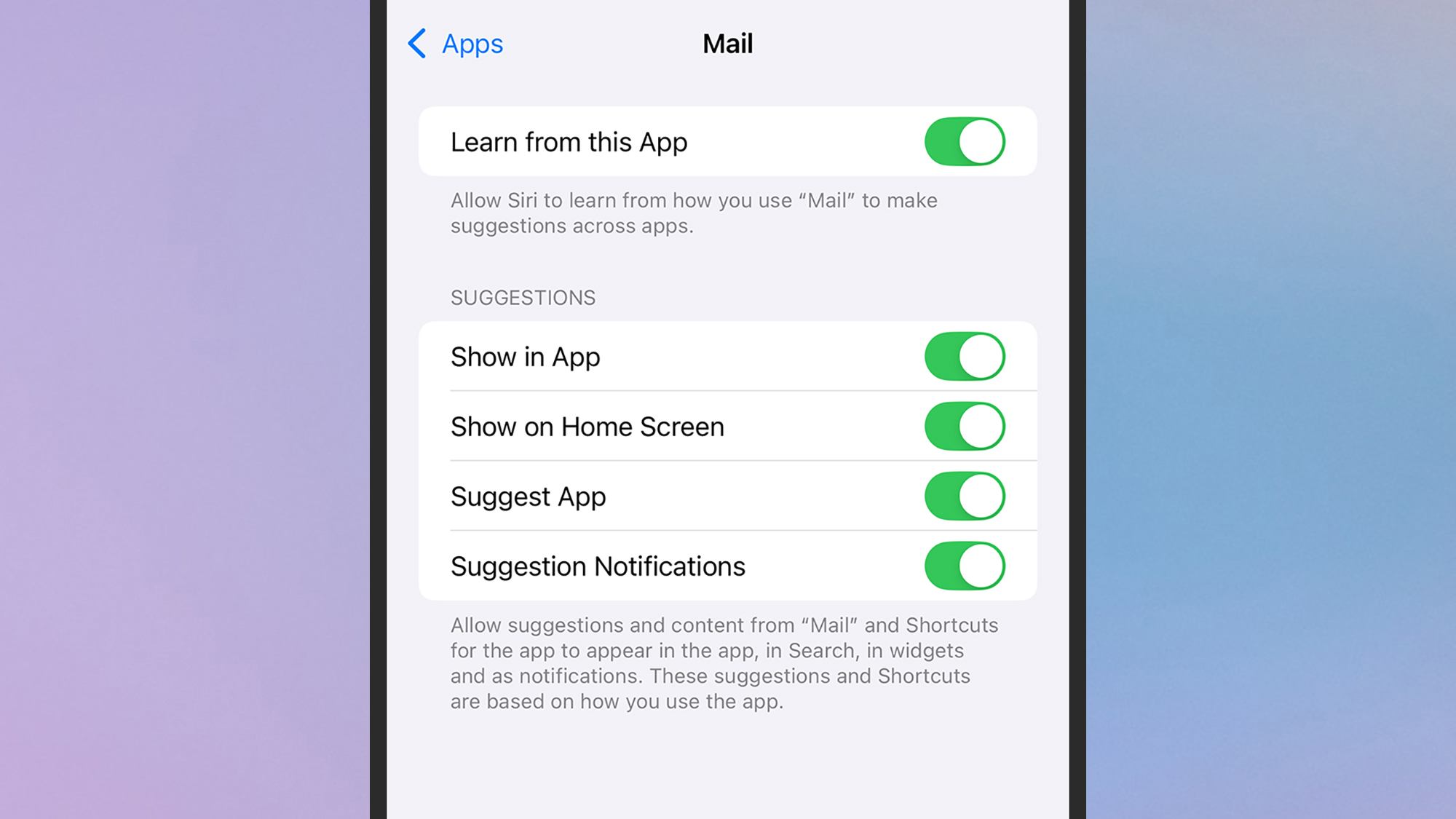 Appuyez par exemple sur Mail pour accéder aux paramètres Apple Mail : la première option estApprenez de cette application, qui permet à Siri de faire des suggestions à partir de vos e-mails. Les quatre commutateurs à bascule suivants vous permettent de contrôler la manière dont les suggestions s'affichent dans Mail, y compris dans l'application elle-même, sur l'écran d'accueil et dans les notifications Apple Mail.