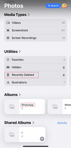 iPhone Photo dispose d'une fonctionnalité récemment supprimée qui stocke les photos et vidéos supprimées au cours des 30 derniers jours, et si vos photos WhatsApp sont supprimées par erreur, vous pouvez probablement les trouver ici.