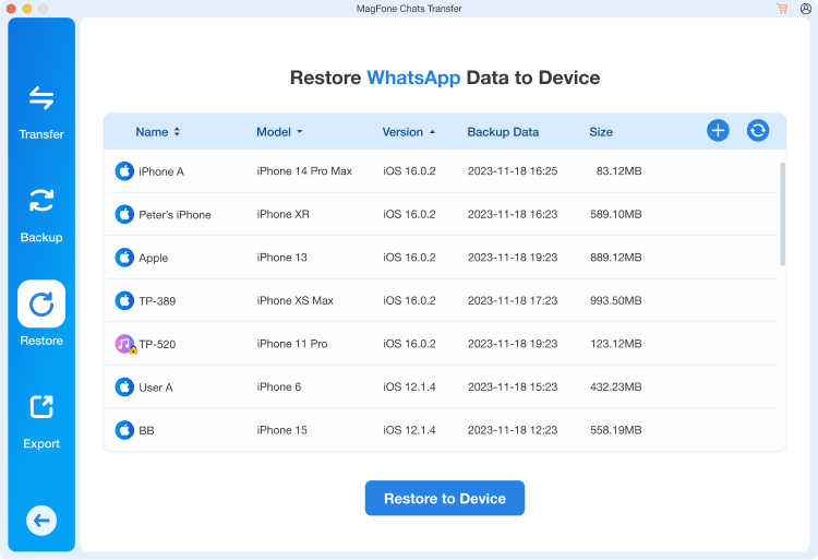 Si vous souhaitez un jour restaurer les messages WhatsApp sur votre iPhone, vous pouvez accéder àRestaurerempiler. Choisissez une sauvegarde et cliquez surRestaurer sur l'appareilpour récupérer tous les messages WhatsApp.