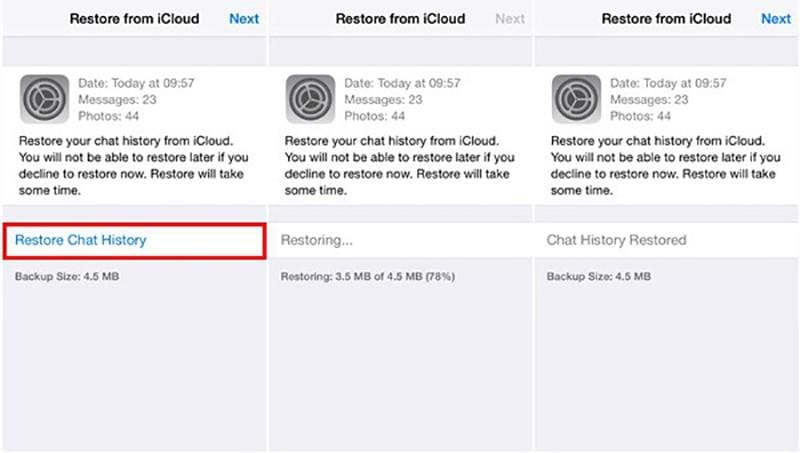 Étape 3.Lorsqu'on vous demande de restaurer une sauvegarde, cliquez sur « Restaurer » et attendez que WhatsApp restaure les discussions à partir de la sauvegarde iCloud.