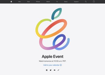 Apple prévoit d'organiser son premier événement médiatique de 2021 demain, le mardi 20 avril, à 10h00, heure du Pacifique, via une diffusion en direct. L’événement devrait voir le dévoilement de modèles d’iPad mis à jour, probablement des informations liées aux nouvelles fonctionnalités d’iOS 14.5, et il y a une possibilité de surprise comme les AirTags ou les nouveaux modèles d’iMac Apple Silicon. Découvrez tout ce qui vous attend dans notre guide À quoi s’attendre.