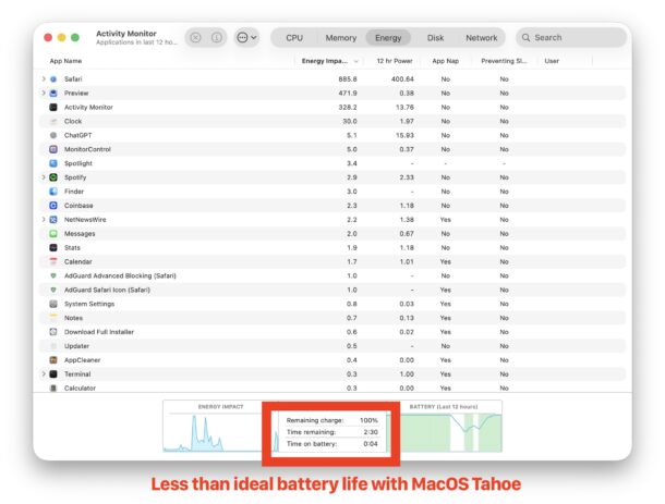 Diverses plaintes concernant la durée de vie de la batterie et macOS Tahoe peuvent être trouvées sur le Web, et j'ai personnellement également remarqué des réductions significatives de la durée de vie de la batterie sur mon MacBook Air depuis la mise à jour vers macOS Tahoe.
